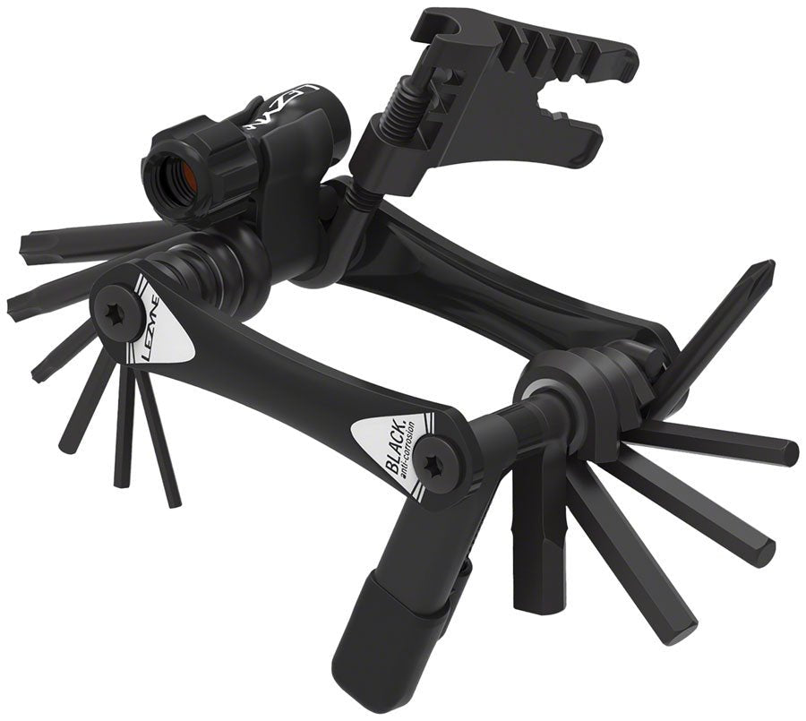 Lezyne Rap Ii - 20 Tubeless Multi Tool - 20 Tools With Chain Tool Tubeless Plug Kit Co2 Inflator Black. Combining undeniable style with precision engineering the Lezyne RAP II series of cycling multi-tools provide unmatched performance. Designed engineered and manufactured in-house each and every RAP II-tool is brimming with innovative featuresΓÇöfrom lightweight ergonomic machined-aluminum side plates with integrated magnetic quick-link holders to longer hardened steel tool bits for easier access to hard-to-reach-bolts. The steel tool bits are made with our Black Anti-Corrosion Technology for increased corrosion resistance. Compact and versatile these multi-tools are built to last and designed to efficiently get riders back on the road or trail.