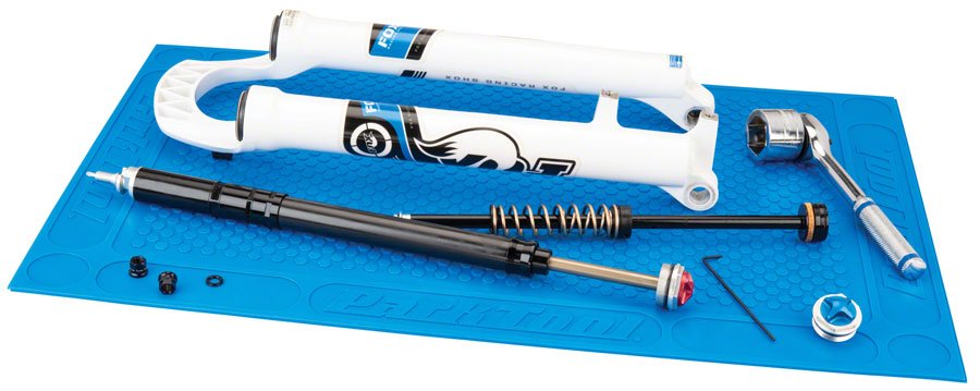 Park OM-2 Bench Mat - 15" x 24.5" Blue. A great way to keep the benchtop organized during a repair the OM-2 features an oversized textured work area and raised trays for organizing small parts and hardware. Perfect for overhauling or rebuilding components such as forks shocks hubs suspension linkages derailleurs etc.Measures 15" x 24.5" (38cm x 62cm)